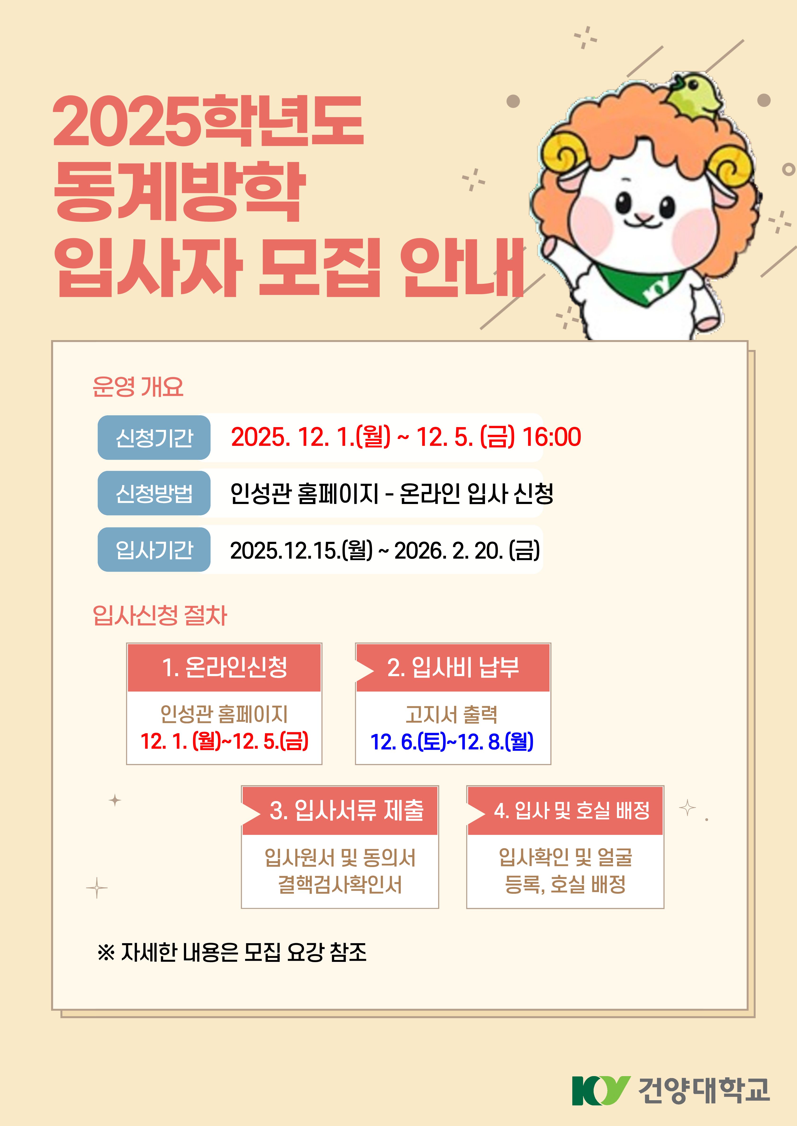 | 제목 | 2025학년도 동계방학 입사자 모집 안내 | ||||