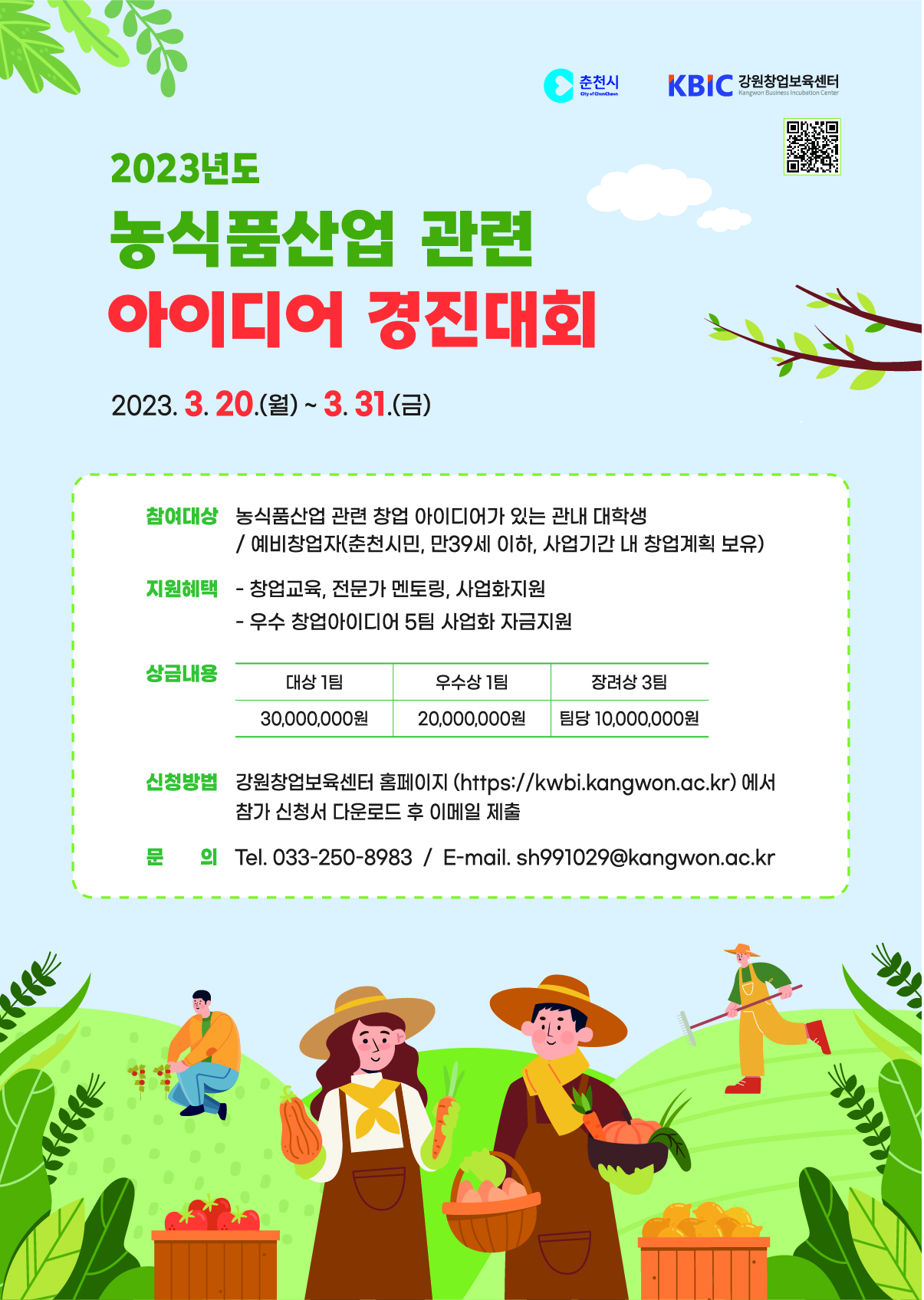 (바로가기 : 강원대학교 강원창업보육센터 (kangwon.ac.kr)) 농식품산업과 관련된 창업아이디어를 발굴하고 진단하여 창업 애로사항 해결을 통한 창업 생태계 활성화를 촉진하고자 『2023년도 농식품산업 관련 아이디어 경진대회』 를 개최합니다. 많은 참여와 관심 부탁드립니다! ■ 공모주제 - 춘천의 지역먹거리를 활용한 농식품산업 창업 아이디어 모집 ■ 기간 및 일정 - 2023.3.20.(월)~2023.3.31.(금), 15:00시까지 ■ 지원자격 - 춘천 관내 대학생 및 예비창업자(춘천시민, 만 39세 이하, 사업기간 내 창업계획 보유) - 신청자 대상 1차 심사를 통해 20팀 선정, 개인 또는 단체(2인 이상)로 참가 가능 ■ 시상내역 - 대상 (1팀) 30,000,000원 - 우수상 (1팀) 20,000,000원 - 장려상 (3팀) 팀당 10,000,000원 ※ 자세한 내용은 공모전사이트 참고 ■ 접수방법 - 강원창업보육센터 홈페이지에서 참가신청서 다운로드 후 이메일로 참가 신청 ■ 문의 - 033-250-8983 / E-mail : sh991029@kangwon.ac.kr |