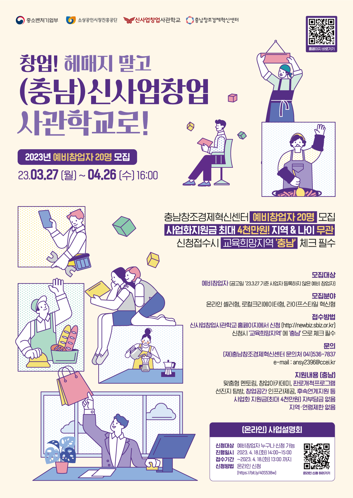 ※ 모집개요 ○ 공 고 명: 2023년 신사업창업사관학교(충남) 예비창업자 모집 공고 ○ 모집대상: 예비창업자(지역, 나이 무관) ○ 접수기간: ’23. 3. 27.(월) ~ ’23.4. 26(수) 16:00 ○ 신청방법: 신사업창업사관학교 홈페이지(http://newbiz.sbiz.or.kr) 신청